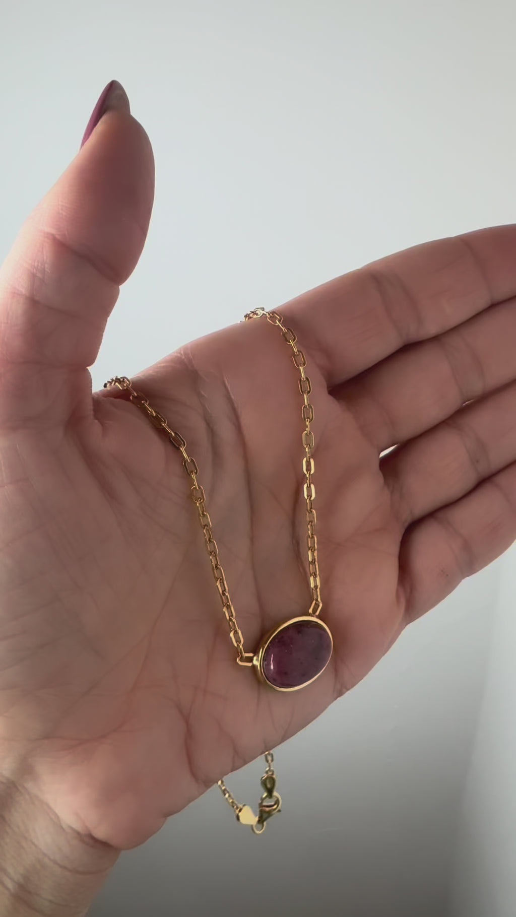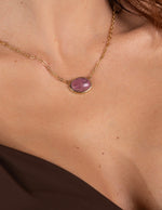 Una collana delicata ed elegante, impreziosita da un pendente con pietra color,ametista dalla forma armoniosa. La montatura dorata in incornicia la pietra esaltandone la luminosità, rendendola perfetta per illuminare il decolletè con discreta raffinatezza.
